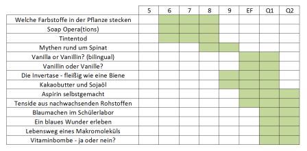 Auf der Abbildung finden sich die aktuellen Projekte der Fakultät für Chemie und Biochemie - angeboten im Alfried Krupp-Schülerlabor. Diese Übersicht ermöglicht es, auf einen Blick zu erkennen, für welche Klassenstufen das jeweilige Projekt geeignet ist.